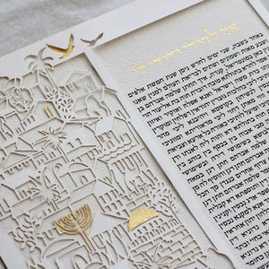 Museum-quality laser-cut Ketubah, with a watercolor print background.