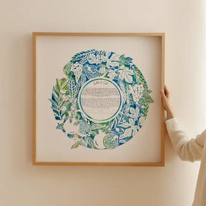 This Seven Species ketubah is a stunning papercut design that features the seven biblical species - wheat, barley, grapes, figs, pomegranates, olives, and dates. The intricate details of the papercut design are set against a warm and earthy terracotta background, creating a unique and visually appealing contrast. This ketubah is the perfect blend of traditional Jewish symbolism and modern design, making it a beautiful and meaningful addition to any wedding ceremony.