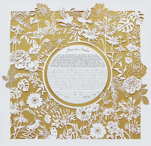 This gorgeous papercut ketubah, with its stunning botanical design, provides a romantic and loving frame that surrounds and highlights the words of the Ketubah. The delicate papercuts of flowers, plants, and birds in intricate detail, will beautifully adorn the walls of your home and provide a special and ongoing reminder of your love.