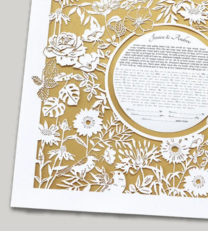 This gorgeous papercut ketubah, with its stunning botanical design, provides a romantic and loving frame that surrounds and highlights the words of the Ketubah. The delicate papercuts of flowers, plants, and birds in intricate detail, will beautifully adorn the walls of your home and provide a special and ongoing reminder of your love.